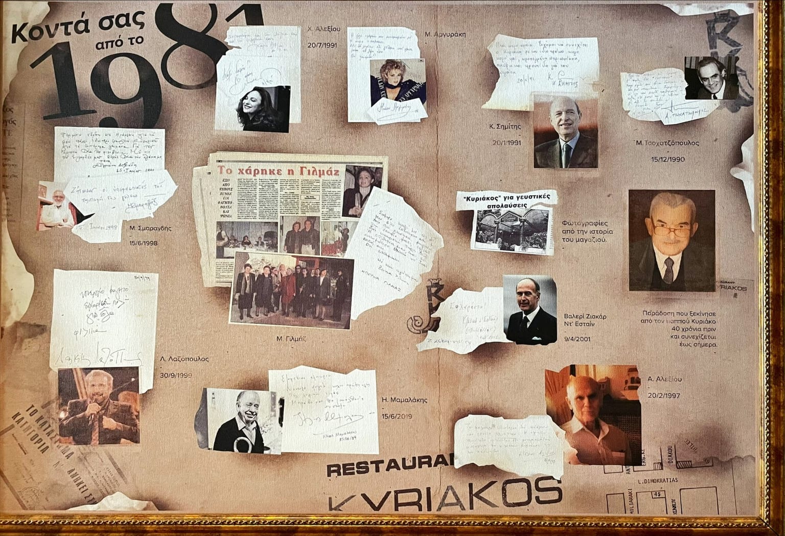 In addition to its excellent cuisine, "Kyriakos" has gained a reputation as a hangout for famous politicians and artists, such as Harris Alexiou and Freddy Germanos, who, when he visited the restaurant, was noted in the guest book: "Never on Sunday" but always at Kyriakos!"