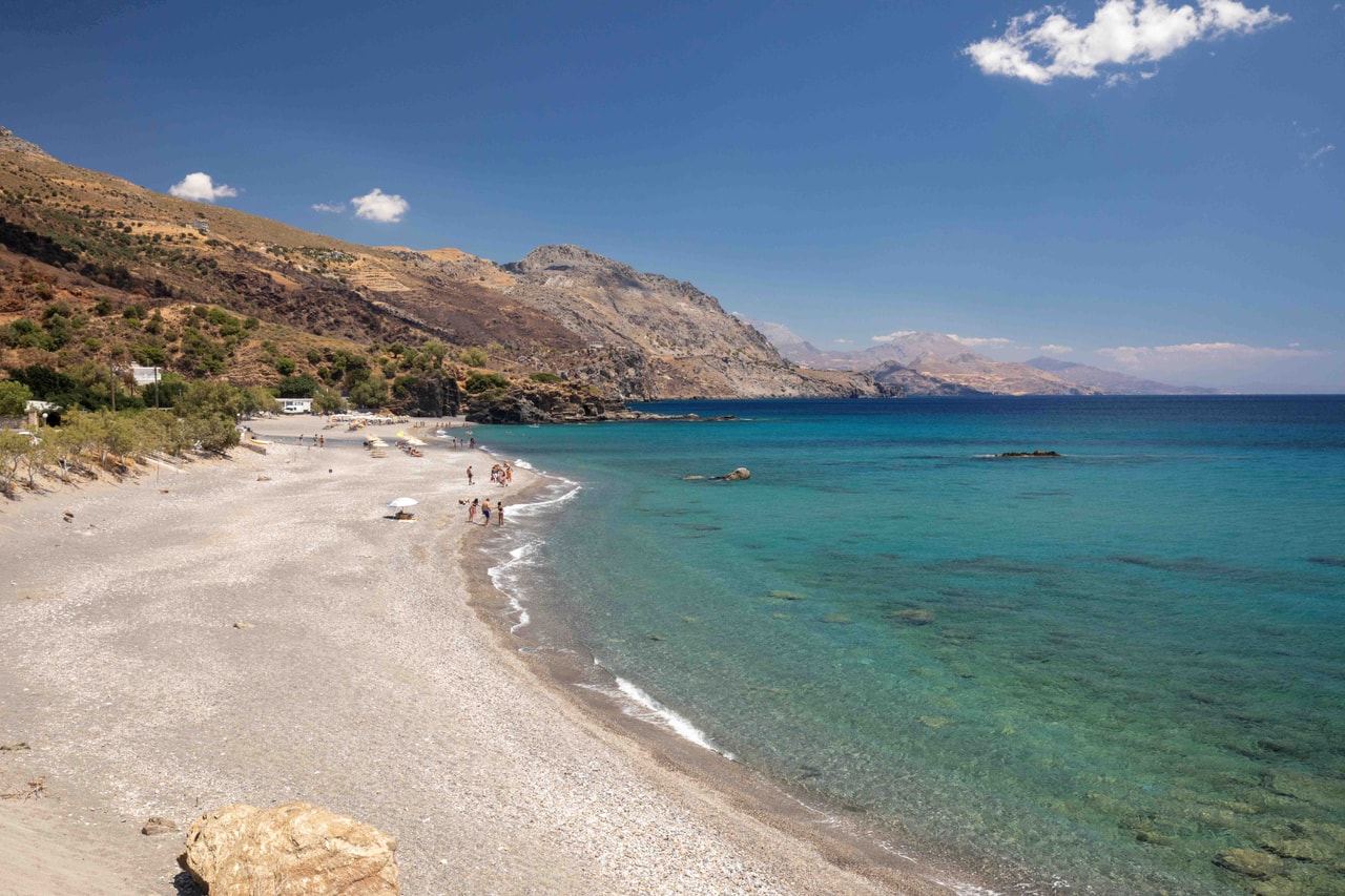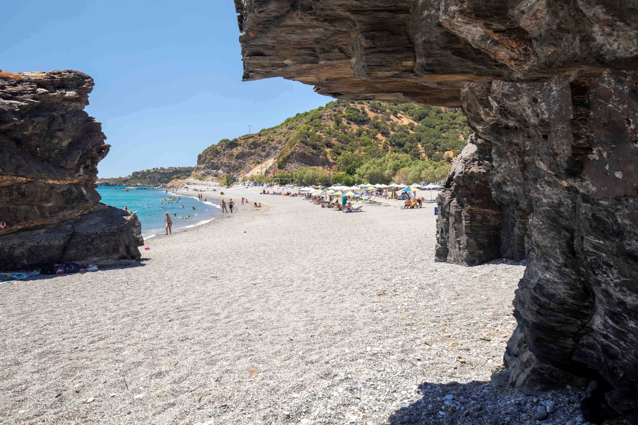 Η παραλία είναι αμμουδερή με ψιλό βότσαλο και οργανωμένη και σχηματίζεται στην έξοδο του ποταμού που διέρχεται από το φαράγγι Ροδάκινο.