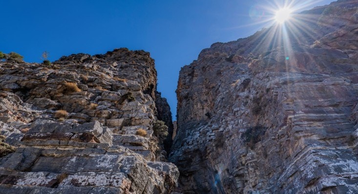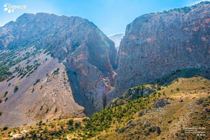 It lies exactly above the active fault of Ierapetra, where it owes its unique geological configuration. The gorge begins at the heart of Thrypti and ends up in the plane of Ierapetra, next to the scenic village Monastiraki. After Pachia Ammos, we drive in the direction of Ierapetra and a few kilometres later, we enter Kalo Horio and we drive to the left to the Thrypti plateau.