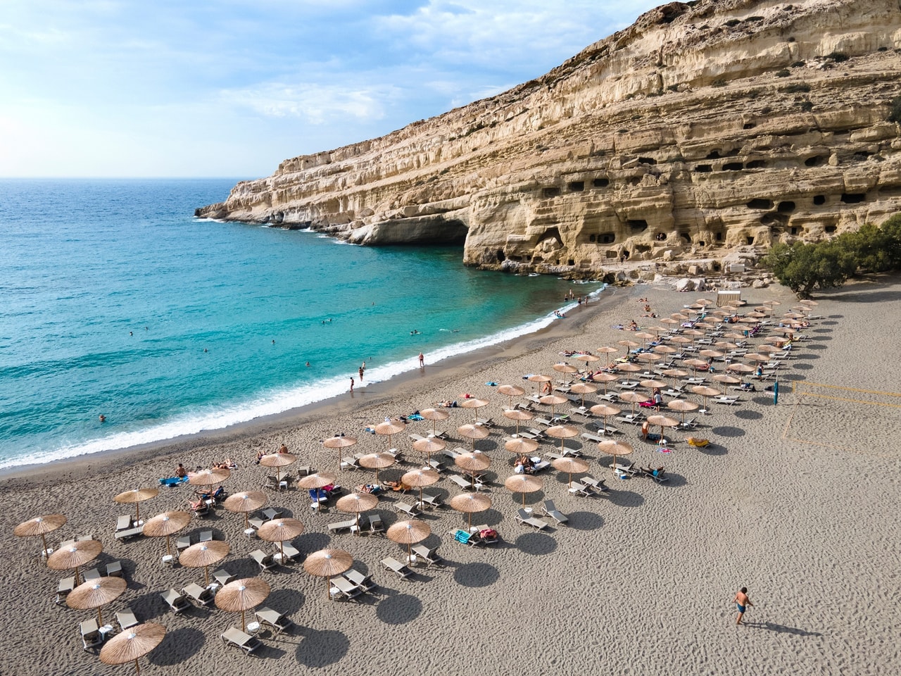Matala is situated 68 kilometres southwest of Heraklion and is a well-loved tourist hotspot in Crete. The Matala beach, known for its distinctive caves and historical association with the hippie community, is a major draw for tourists interested in experiencing the place where the ‘flower children’, as they are affectionately known in Greece, lived during the 1970s.