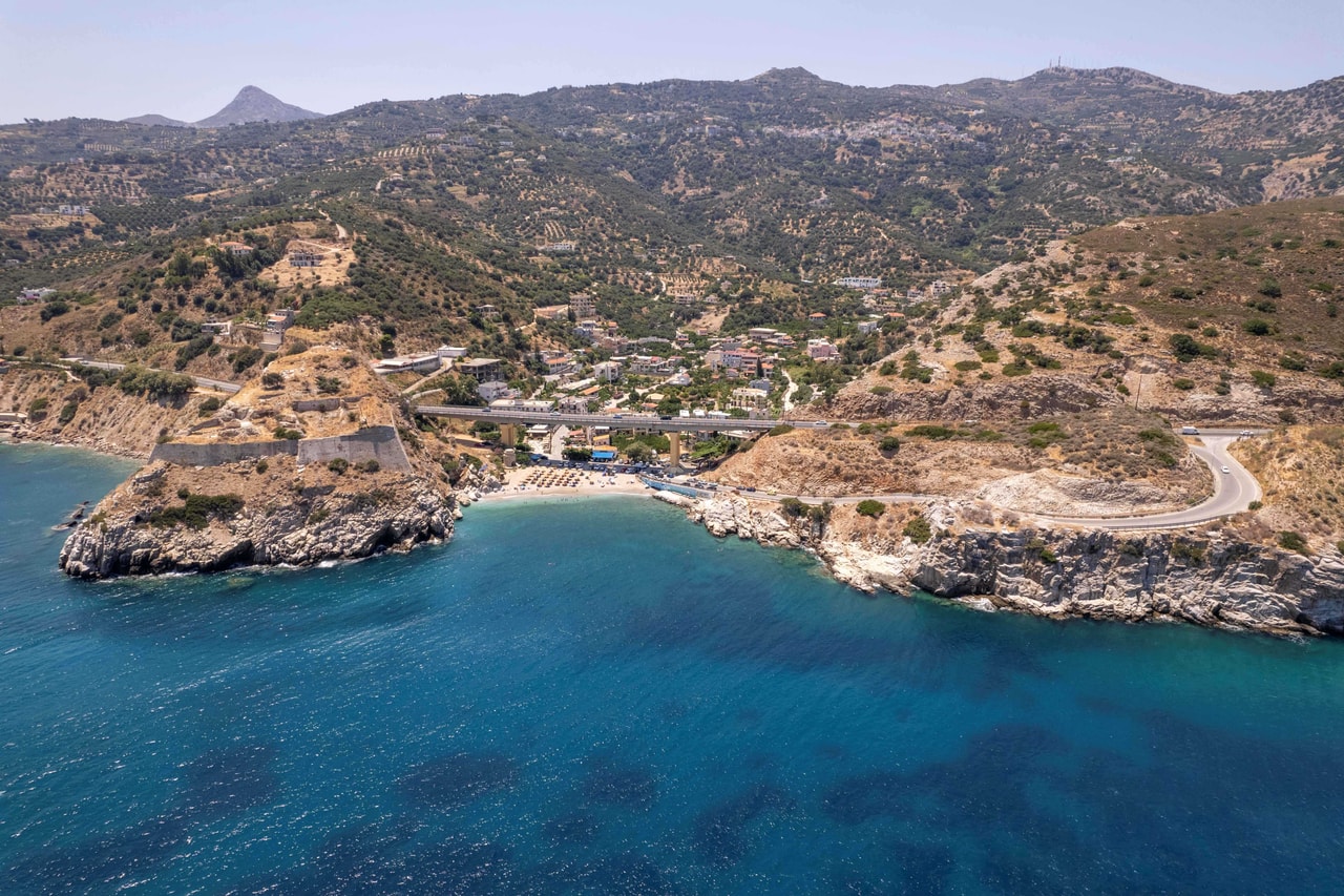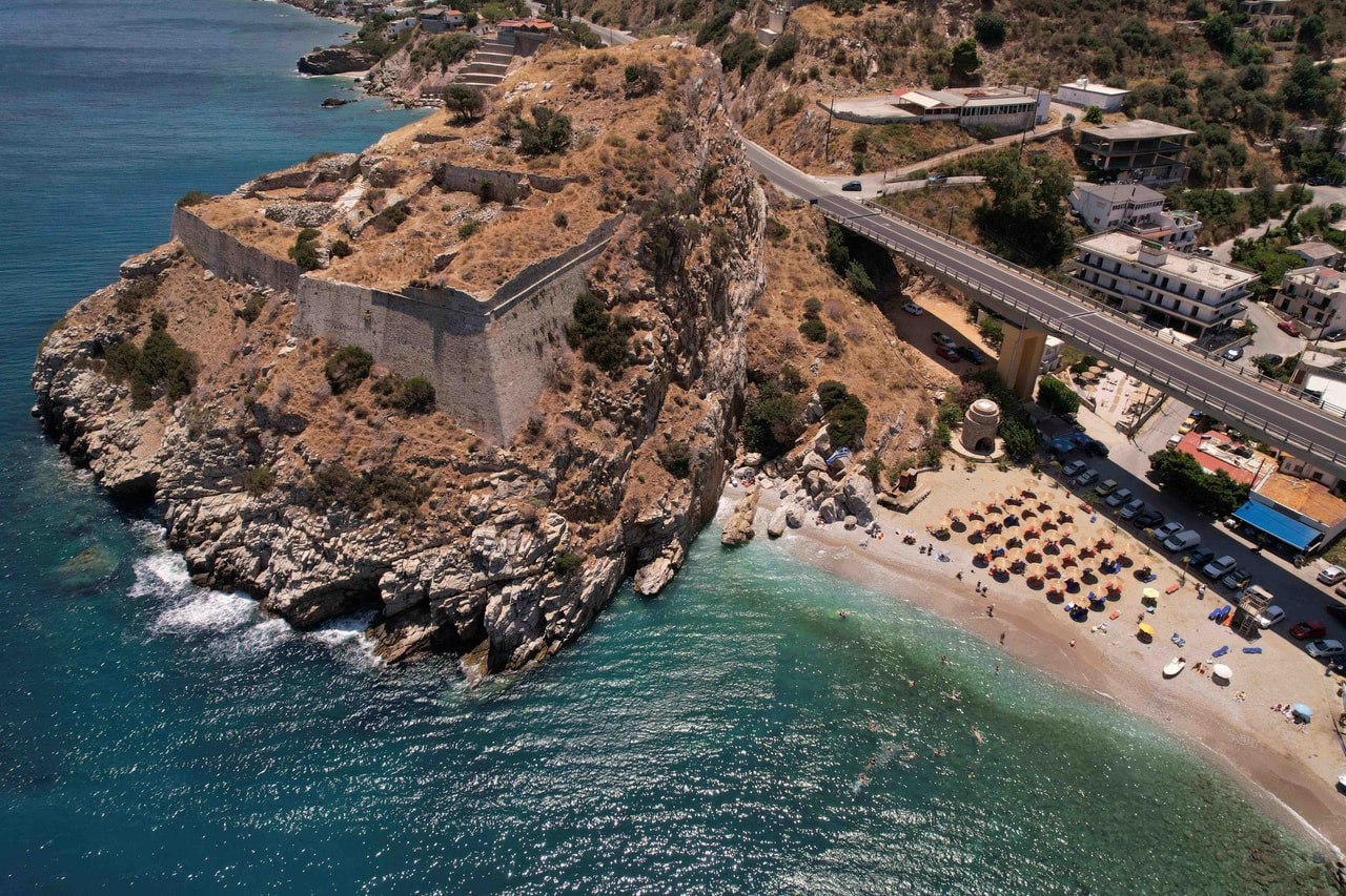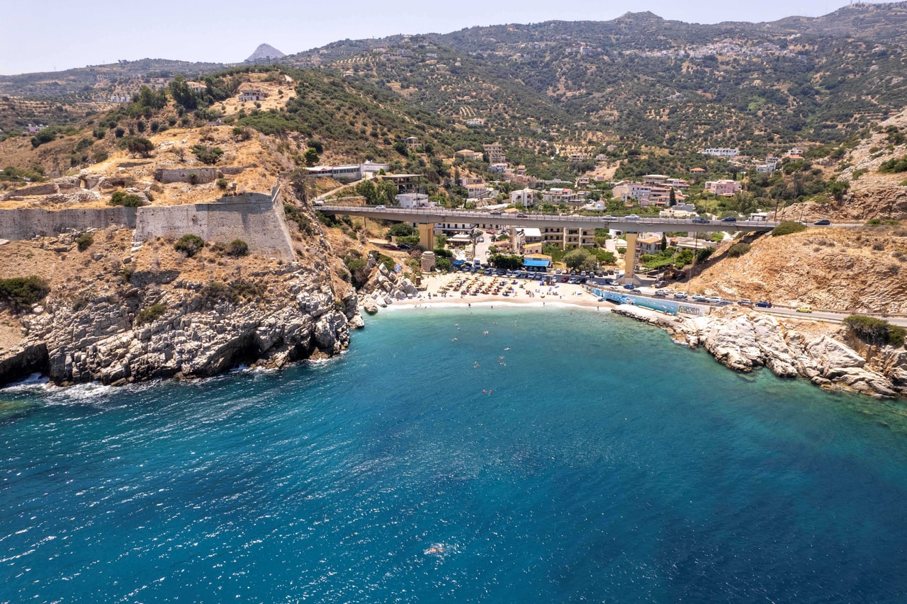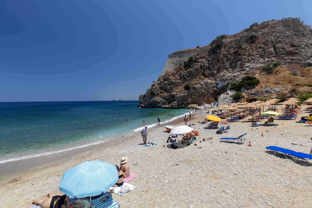 To the right of the beach, a towering rock hosts the Venetian castle of the area, alongside a distinctive narrow cave. Historical reports suggest that the cave served as an escape route from the castle in the past.