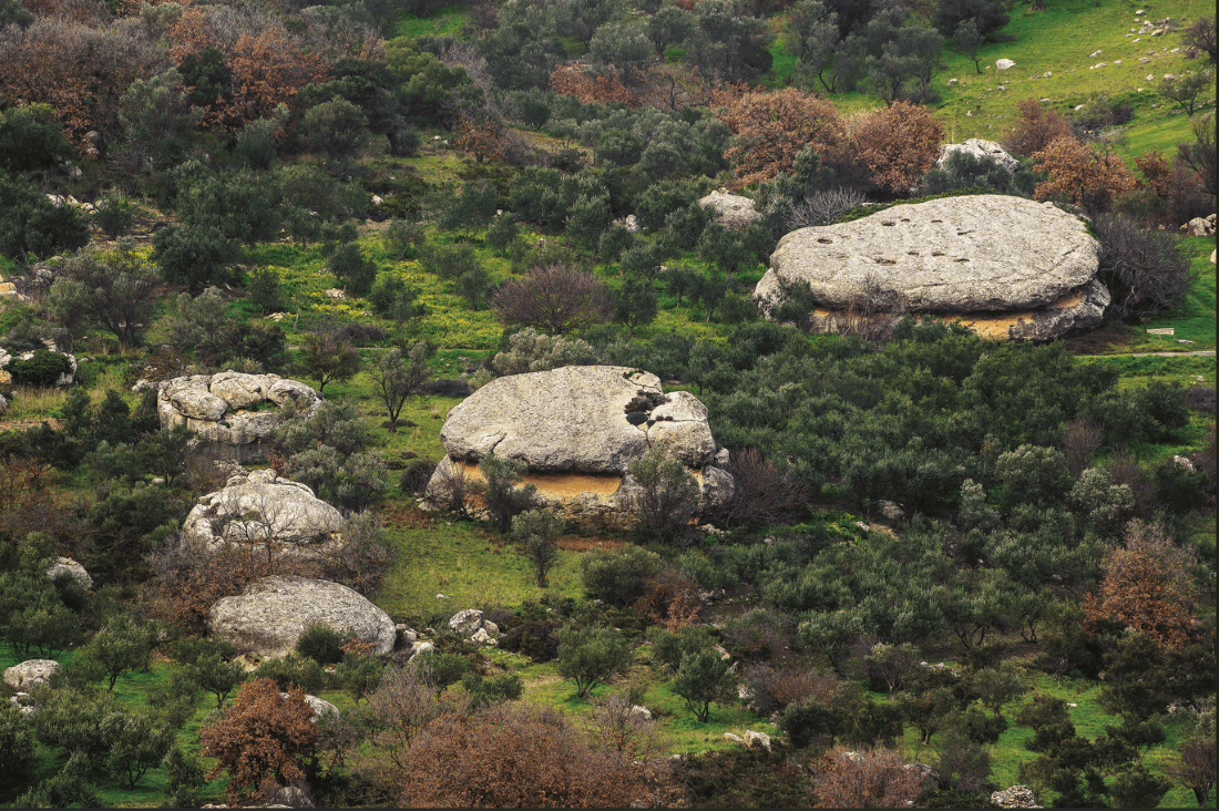 Indeed, these limestones, measuring 6-7 cm, prove insufficient for the relentless forces of nature. Over the years, laden with numerous fossils of sea urchins and bivalves, they have descended from the summit of the adjacent hill, Patela, where the remnants of the Minoan city of Rizinia lie. The substantial limestone pieces undergo dissolution by water, gradually taking on rounded forms. Simultaneously, due to their composition of two layers of limestone, water dissolves the rock along the dividing surface, creating a groove within each boulder. This dual process contributes to the distinctive shape of the rocks.