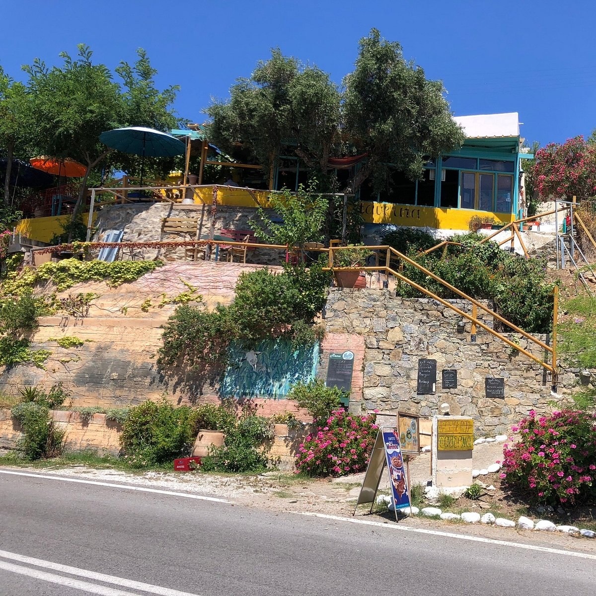 On the provincial road from Agios Nikolaos to Sitia, approximately 22 kilometers from Sitia, you will find the beautiful village of Myrsini and the alternative tavern En Route (Kath' odon)!